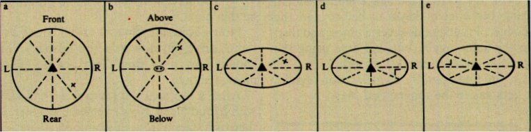 Click here for larger imageThis is just like an Earth radar, but in three dimensions. Figure IIa shows an Earth radar display with your ship at its centre. The cross represents an enemy ship, which in this case is to the right and behind you.