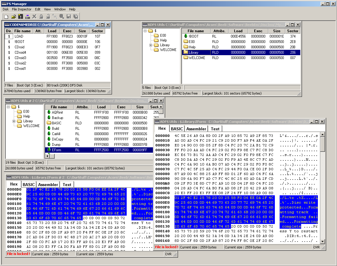 I wrote some DFS routines (for the PC) which might come in handy for other projects I'm thinking about and as an offshoot, I quickly cobbled together an application that uses them to read BBC Micro disk images on a PC. At present DFSExplorer by Jon Welch does so much more so much better. The main difference between Jon's and mine is that this uses an MDI interface (where you can have lots of child windows within your application - like excel etc.). Some people may or may not prefer this approach. If people like the feel of the app and would like me to add in more functionality then I will do so. Rememeber this has had little testing so you may get the odd bug or two. To submit feedback, either leave a message in the appropriate thread on the Stairway to Hell forum or email me at navalenigma AT hotmail.com |